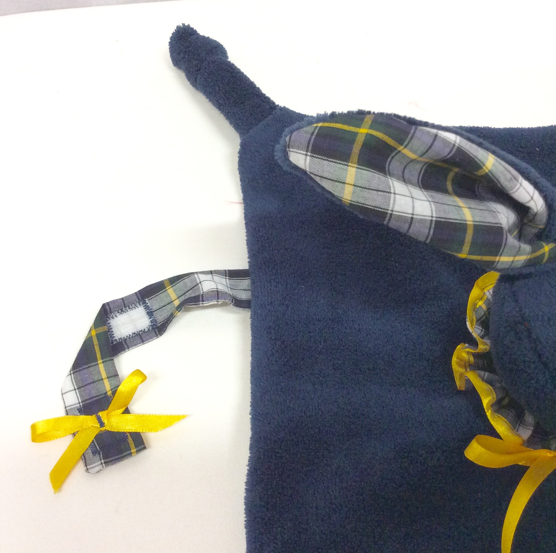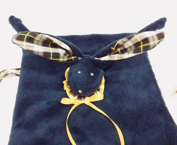 Un socle en polaire bleu marine doublé du tissu écossais accueille la tête de doudou lapin et propose quatre petites pattes, terminées par un noeud à chaque angle. Elles constituent un accessoires de choix pour saisir doudou et l’emporter partout avec soi. Un languette en coton écossais munie de velcro est placée sur un côté pour pouvoir y accrocher une tétine. Une collerette froncée habillée d’un ruban jaune unit la tête au socle.