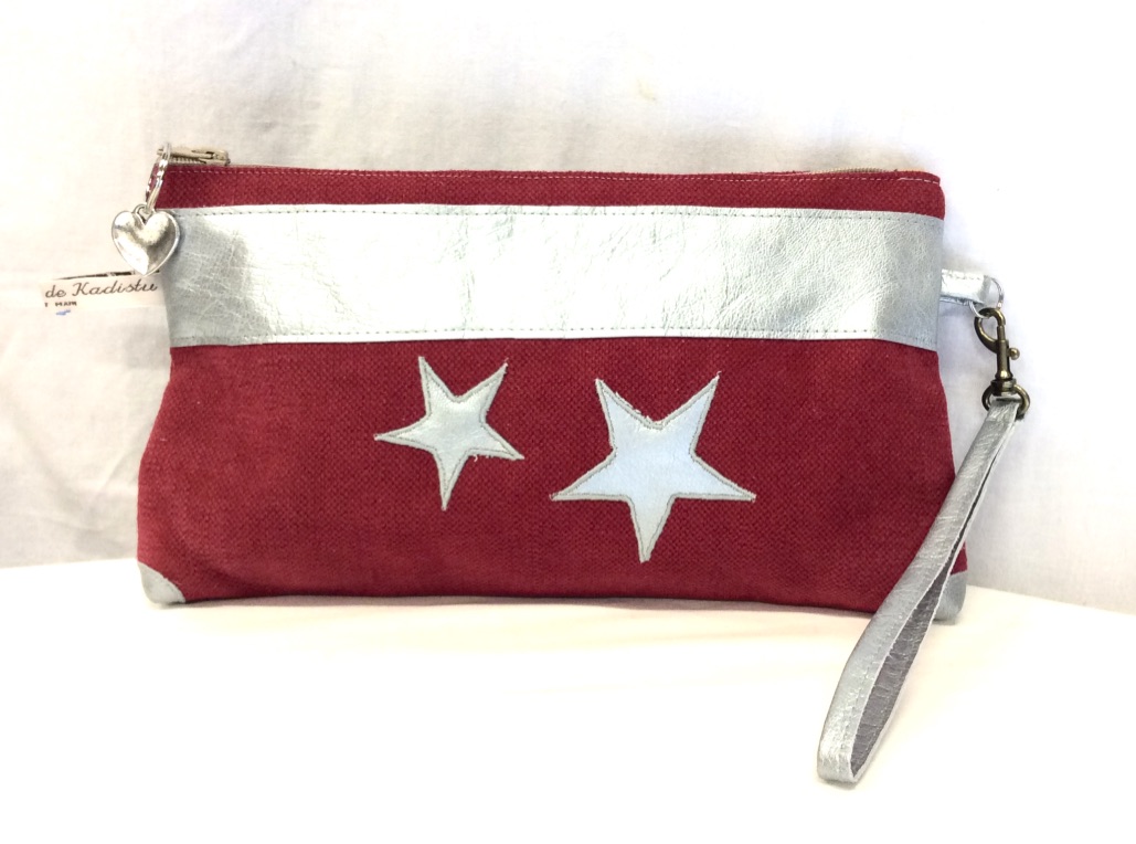Pochette à main collection Maya, réalisée dans une toile rouge, ornée d’une bande de cuir argenté et de deux étoiles argentées. Quatre angles en cuir renforcent sa base tout en lui apportant une touche esthétique