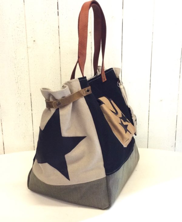 Sac cabas réalisé en toile beige et noir avec en son centre une poche en cuir dorée ornée de deux étoiles noires. Un rabat en cuir doré ferme la poche par un bouton en col de cygne. Les côtés en toile beige affichent une grande étoile noire. Des lanières en cuir de chaque côté permettent d’ajuster la taille du sac en fonction des besoins, par l’intermédiaire de boutons pression. Un ours étoilé s’accroche à un anneau et constitue un bijou de sac