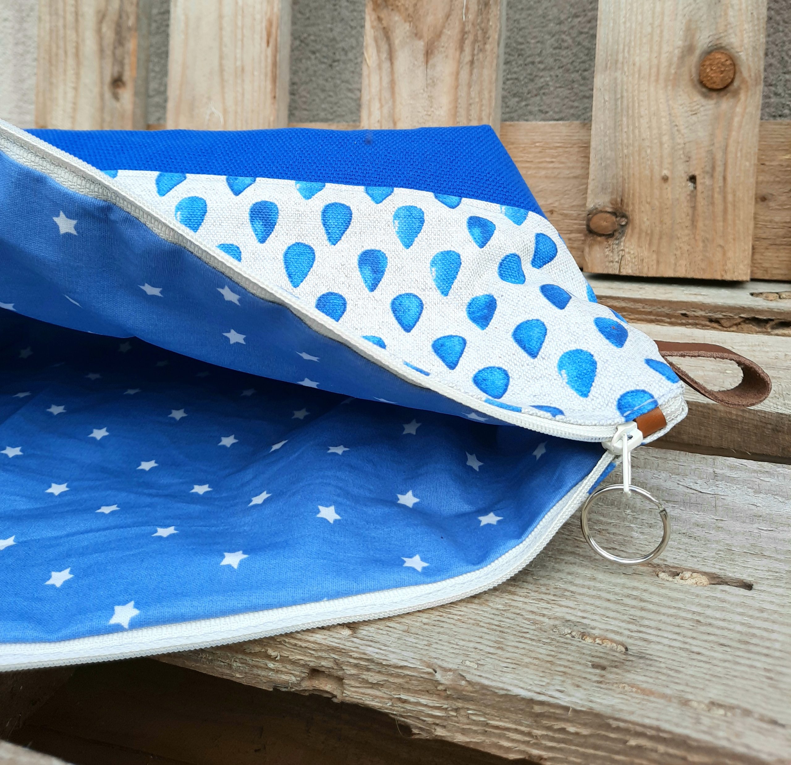 Tout un univers de vacances qui émane de cette trousse de toilette écru sur un imprimé de gouttes bleues en coton enduit avec une base en coton bleu qui ne peut que nous rappeler le bleu de la mer ….