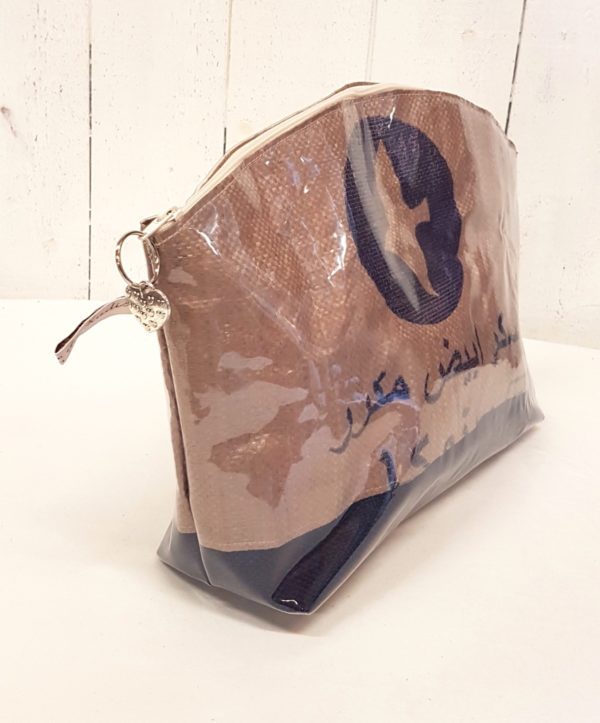 Une trousse de toilette réalisée dans un sac de marchandise aux tonalités de rose présentant un médaillon bleu marine avec un oiseau stylisé en son centre accompagné d’inscriptions arabes. Elle est protégée et consolidée par une toile vinyle transparente qui lui apporte une belle tenue.